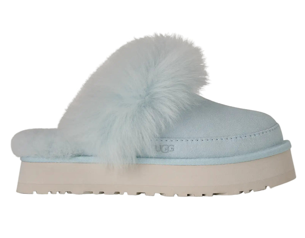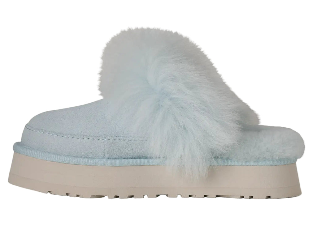 When the weather outside is frightful, our Disquette Chalet is so delightful. This decadent slipper delivers surrounding warmth, from the sheepskin insole and UGGplush lining to the fluffy sheepskin collar. Designed to be worn both indoors and out, it's set upon a 1" platform made from lightweight (and super cushy) sugarcane EVA.