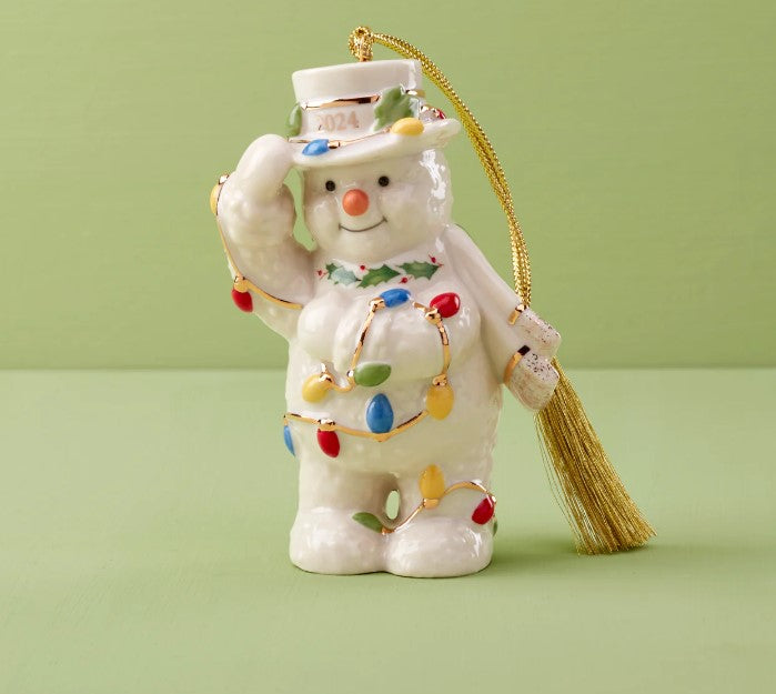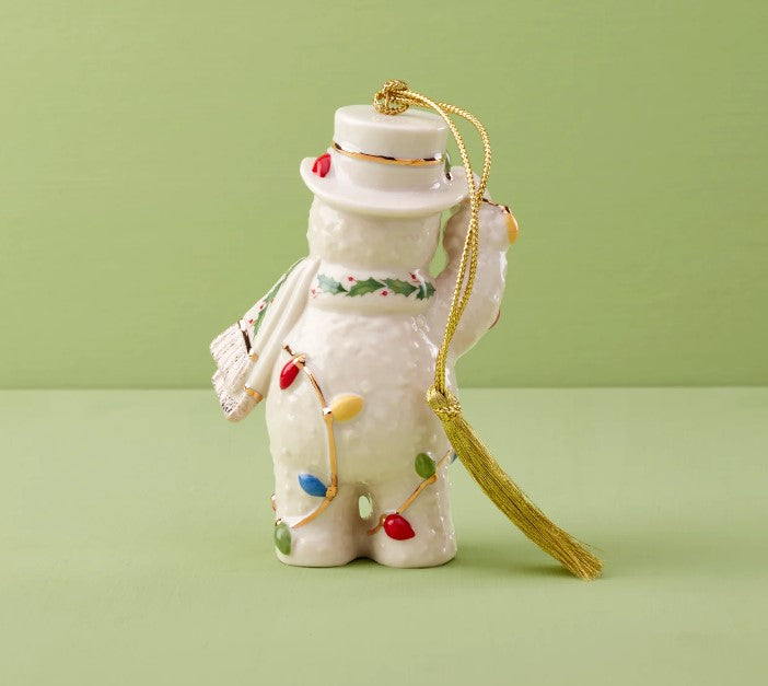 This festive snowman ornament is sure to brighten the holidays, and not just because he'd tangled in a colorful string of Christmas lights! Featuring a fan-favorite holiday patterned