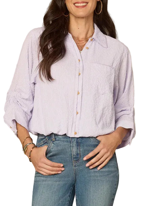 Democracy upgraded the classic button down shirt and given it fresh design elements. This woven style has three quarter tucked sleeves, an embroidered scallop pocket, bubble hem, spliced stripes, and a fun, crinkled texture.
