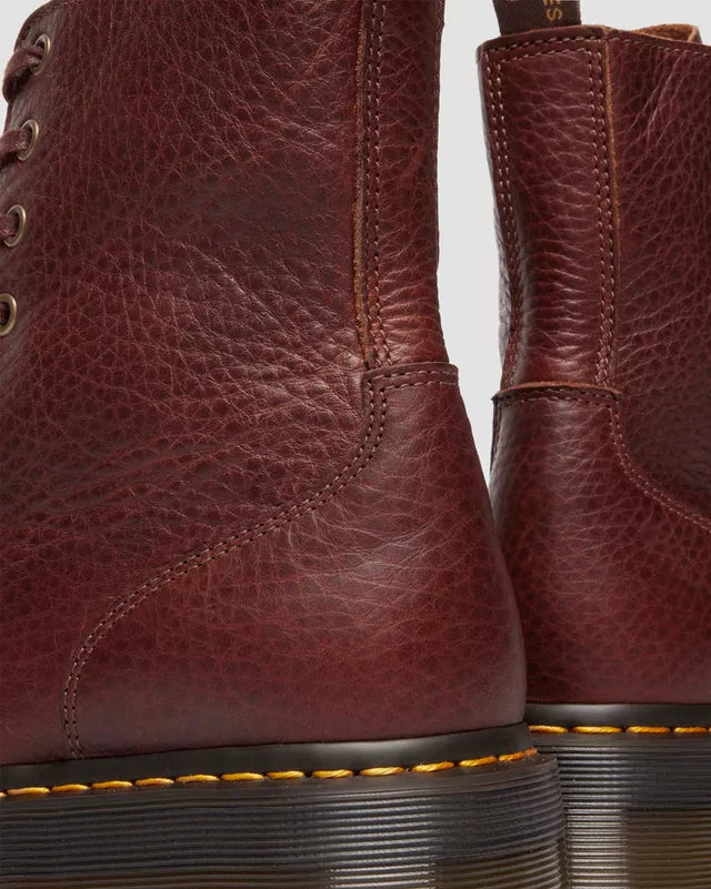 A soft, tonal take on a cult classic. The Jadon boot is modified in a deeper, richer leather. Rewrapped in Ambassador, a leather that masters being both heavyweight in feel and soft to touch. A fresh colorway speaks to the season with complementing Indian antique gold hardware and a tonal stitch across the silhouette. We completed the boot with signature DM’s markings: our scripted heel loop, yellow welt stitching and a trans Quad platform sole.