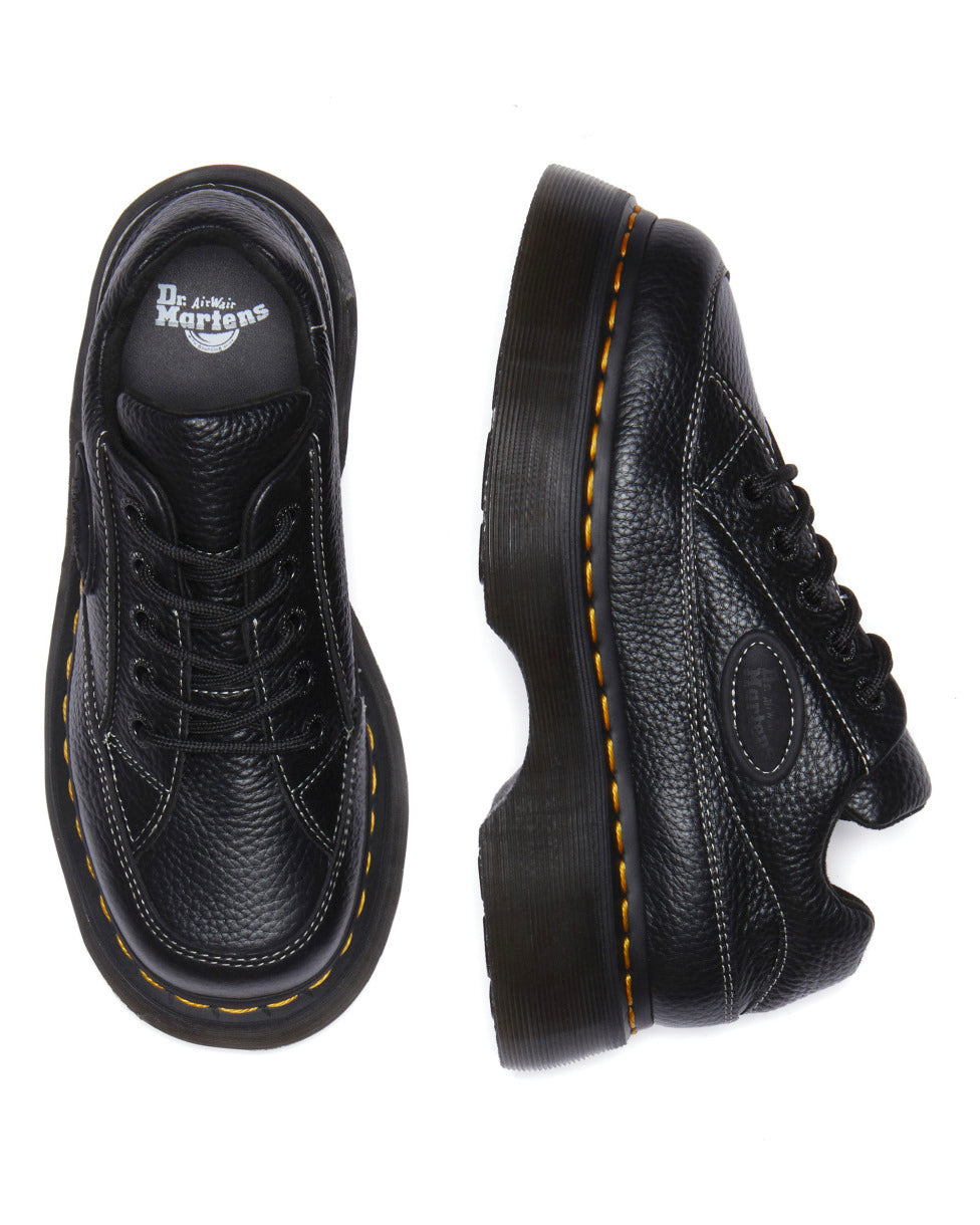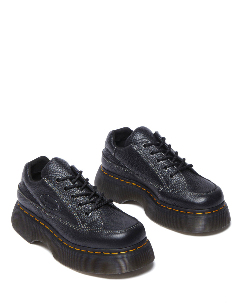 Feel the Buzz. Inspired by Dr. Martens' 90s silhouettes, the new Buzz 5-eye shoe grabs attention from top to bottom. It stands on the chunky barrel-edge Buzz sole — marked with DM’s grooving, yellow welt stitching, and a leaf pattern on the undersole. The soft Milled Nappa leather upper has a comfortable padded collar and an inflated, rubberized badge that echoes the contours of the sole. The shoe also comes with an alternative pair of fluffy black laces.