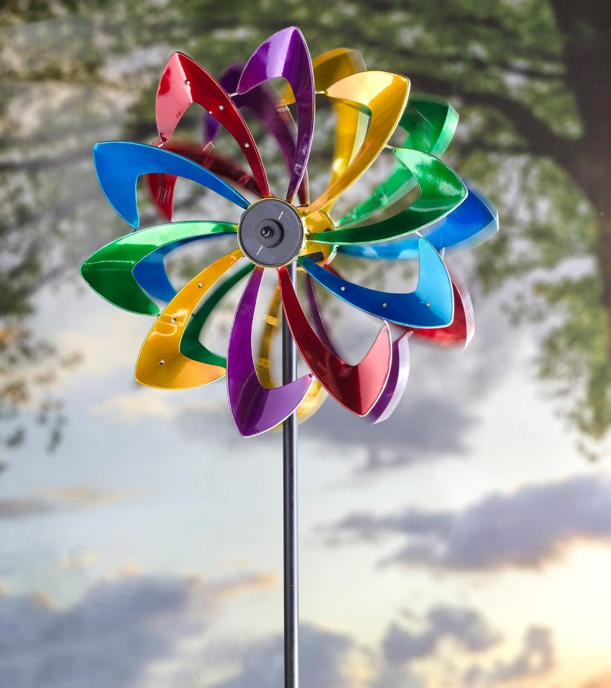 This LED Flower kinetic solar wind spinner comes alive with each passing breeze, producing a mesmerizing visual show. Crafted from powder-coated metal, the piece is durable and weather-resistant. The solar-powered design illuminates the piece at night.