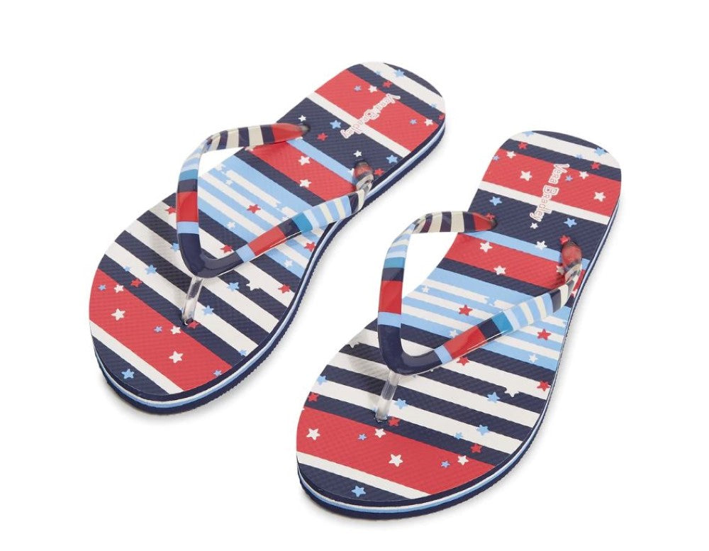Slip into the now even softer statement flip flops featuring a more contoured shape for feet-pampering comfort. The pretty printed footbed with contrasting striped soles looks polished poolside with your perfect pedicure and a golden glow. Feeling relaxed yet?