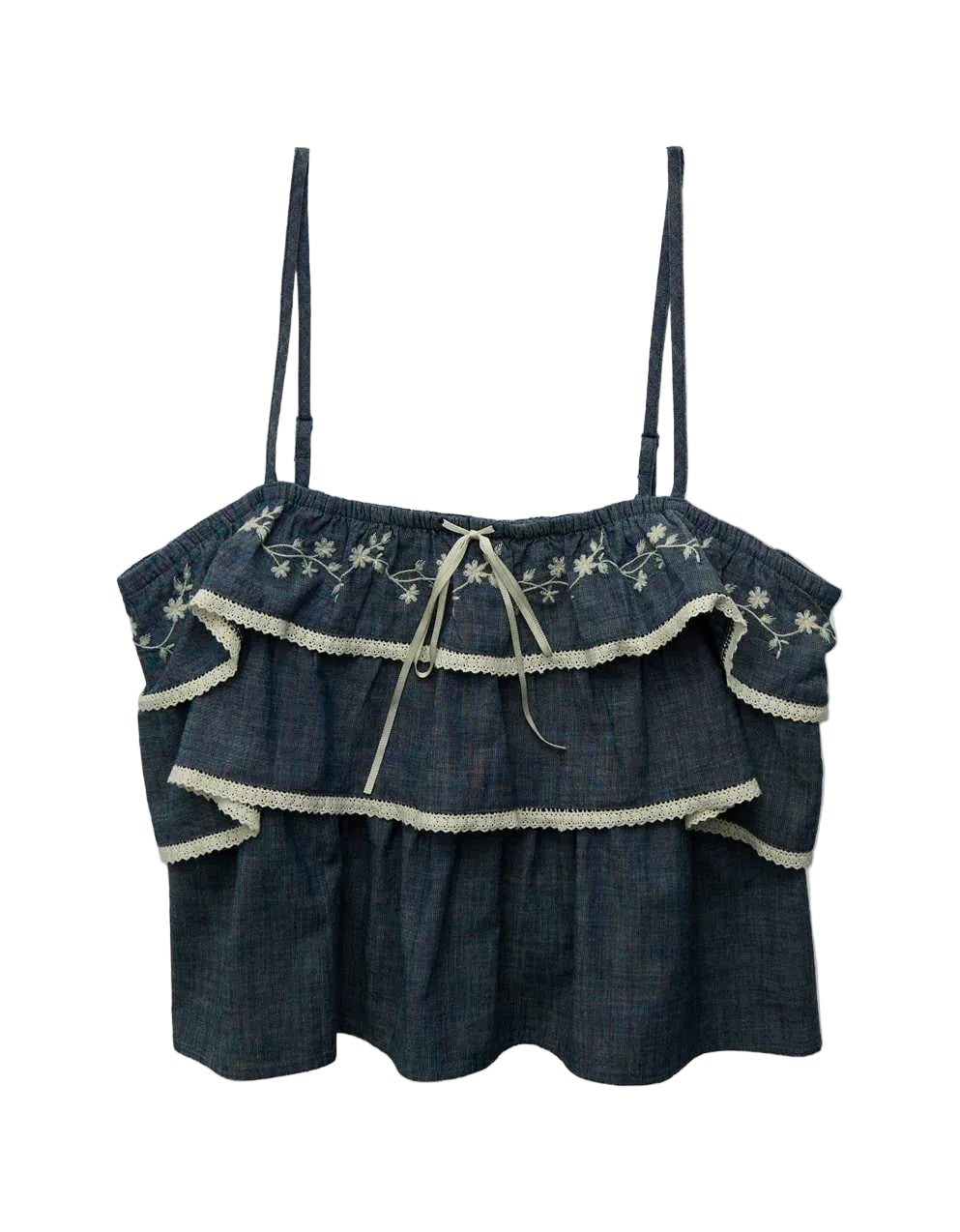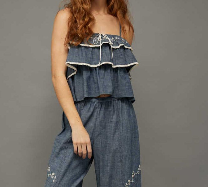 Cute and femme with floral embroidery and a ruffled body.
