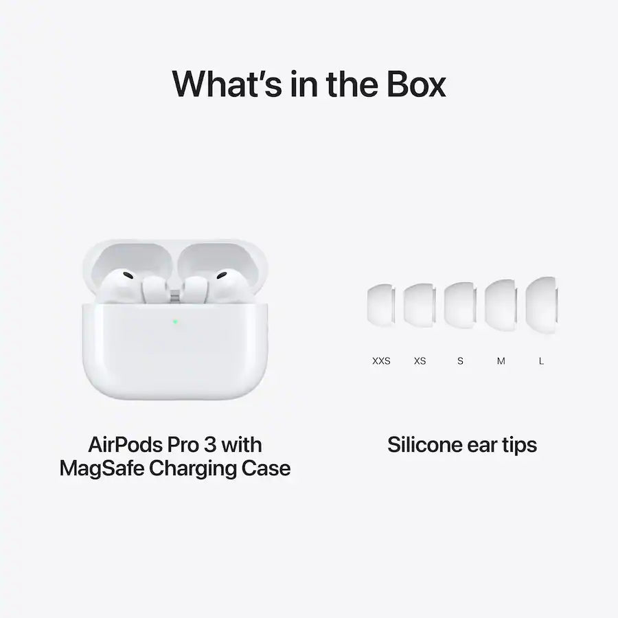 AirPods Pro 3MagSafe Charging Case (USB‑C) with speaker and lanyard loop, Silicone ear tips (five sizes: XXS, XS, S, M, L), Documentation, USB‑C Charge Cable sold separately