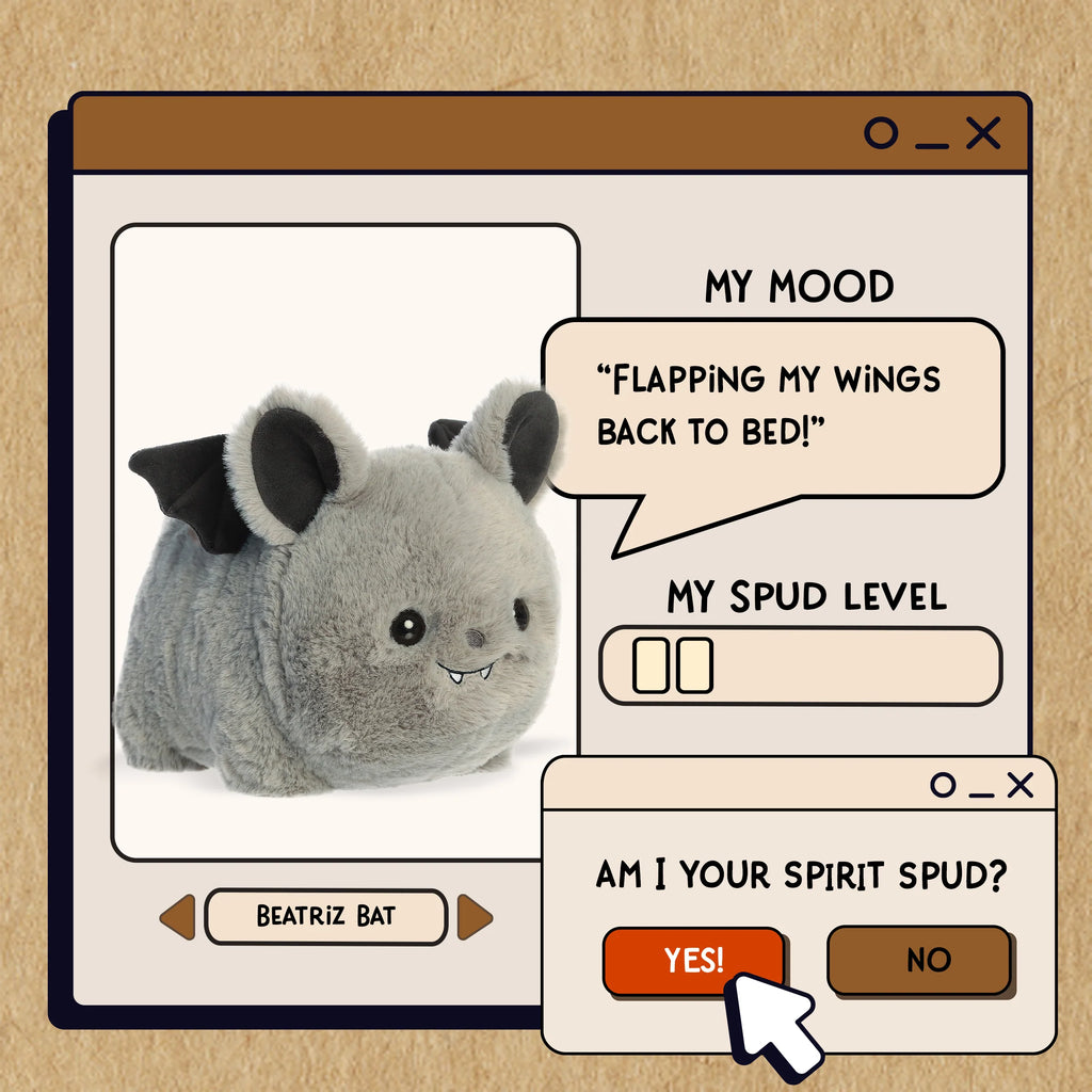 Meet the Happy Hashbrown, Beatriz Bat, from the unique Spudsters collection by Aurora plush! Beatriz isn’t your average bat; she combines the endearing features of a friendly bat with the round, cozy body of a potato, making her the perfect plush for both playtime and bedtime.