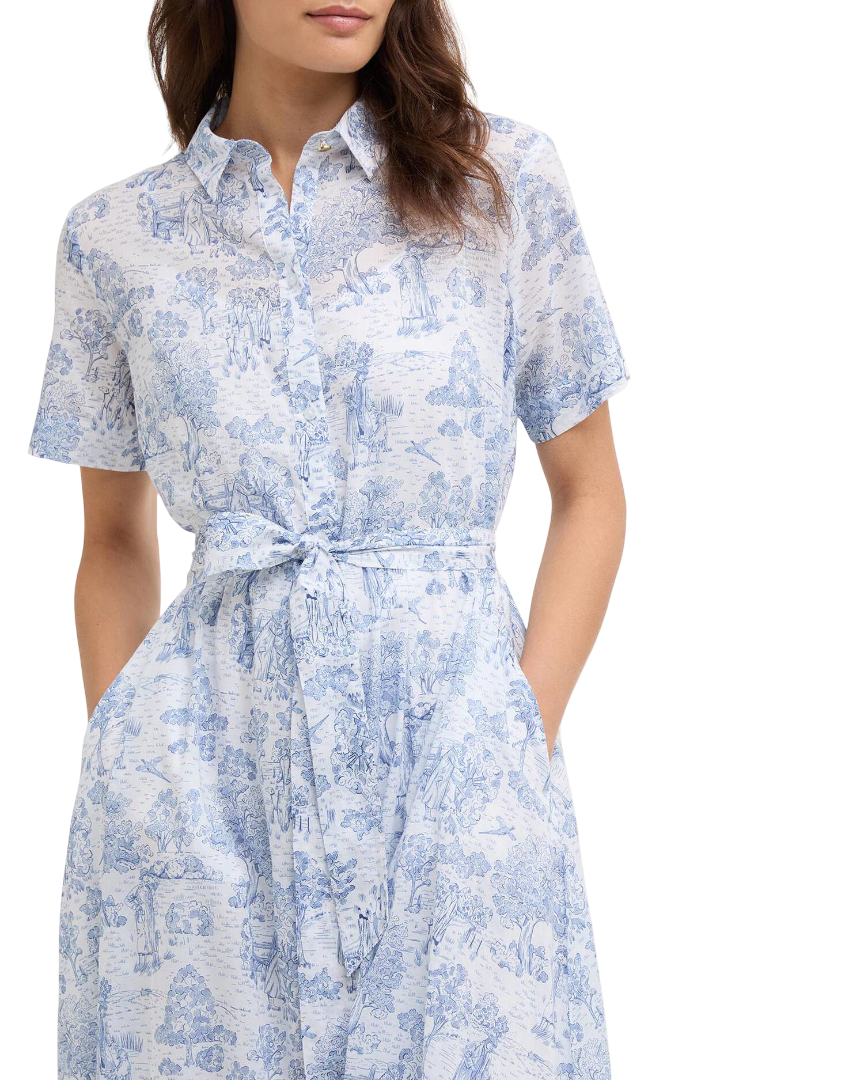 The Barbour Wisteria Midi Dress is a relaxed-fit style crafted from 100% lightweight cotton in a delicate toile de jour print. Featuring a branded brass shank button at the top neck, branded imitation mother-of-pearl buttons along the front placket and cuffs, and an ID bar at the back neck, it offers timeless Barbour detailing in a feminine silhouette.