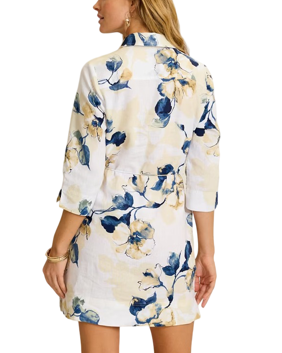 Defined by its modern floral print set on a solid white foreground in our bestselling Two Palms linen, this 3/4-sleeve dress offers elegant and elevated season-spanning wear.