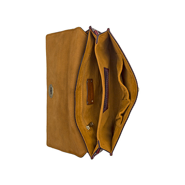 Interior: 2 main compartments, 1 zip pocket, 2 slip pockets, 4 credit card slots; faux suede lining, 100% polyester, leather trim, nylon lining/Exterior: 1 rear slip pocket with magnetic snap closure, burned edge finish
