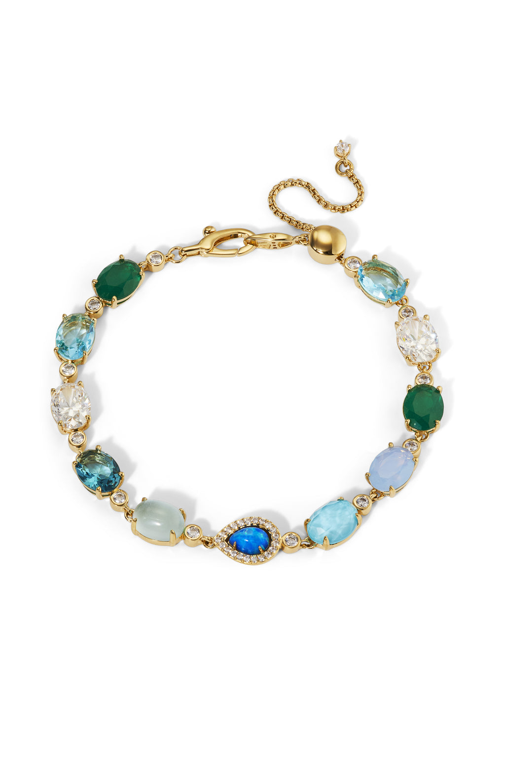 Indulge in vacation vibes with this colorful and tropical design featuring blue-green stones and cubic zirconia. This glamorous bracelet will transport you to a vibrant getaway!