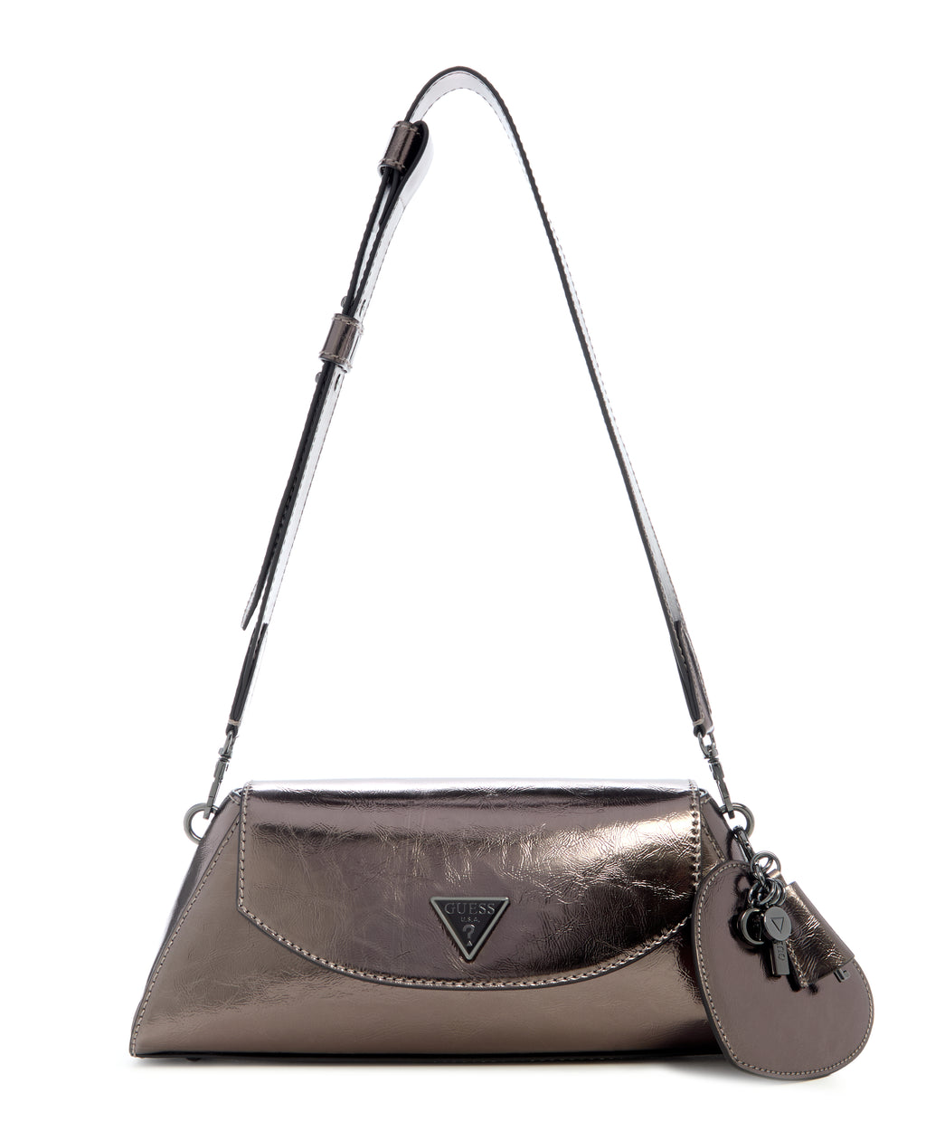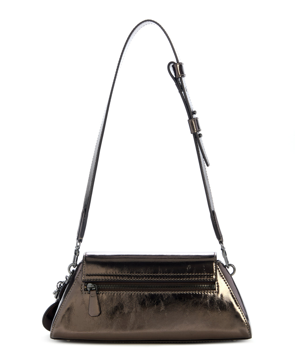 Product Details:MetallicFlap top closureBack zip pocketFeet at base