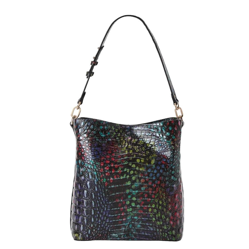 Celina is a trendy new twist on a bucket bag. This has an adjustable shoulder strap and an open top with a bridge closure for easy access to your essentials. The spacious interior has added functionality with a jewelry pocket and key clip for keeping your most precious items secure. Stylish new hardware at the sides gives this added freshness with ease.