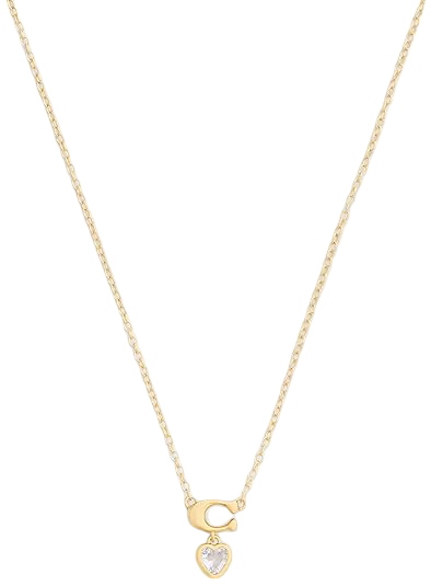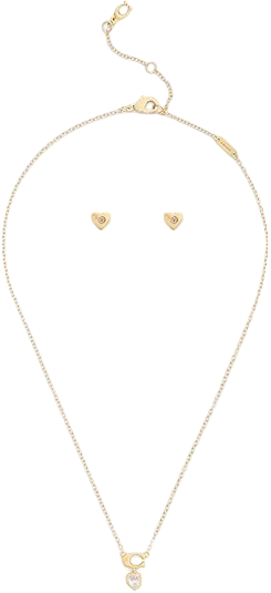 Delicate everyday jewelry set featuring coordinating necklace and earrings. Refined chain necklace with signature sculpted C and cubic zirconia heart pendant, paired with coordinating stud earrings to complete the look. Posts are made from hypoallergenic titanium. Necklace has an adjustable lobster clasp closure. Earrings have a post back closure. Made from brass, cubic zirconia and titanium. Comes packaged in a signature Coach Gift box.