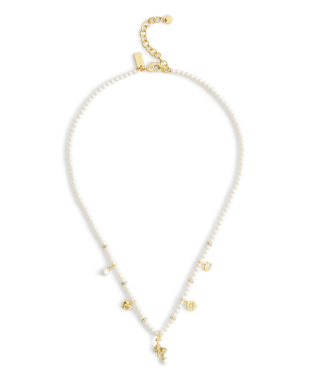 Strung with delicate glass pearls, this necklace features a playful kitten charm set amidst an array of our iconic Coach motifs. Accented with sparkling crystals, it’s finished with an adjustable clasp closure.