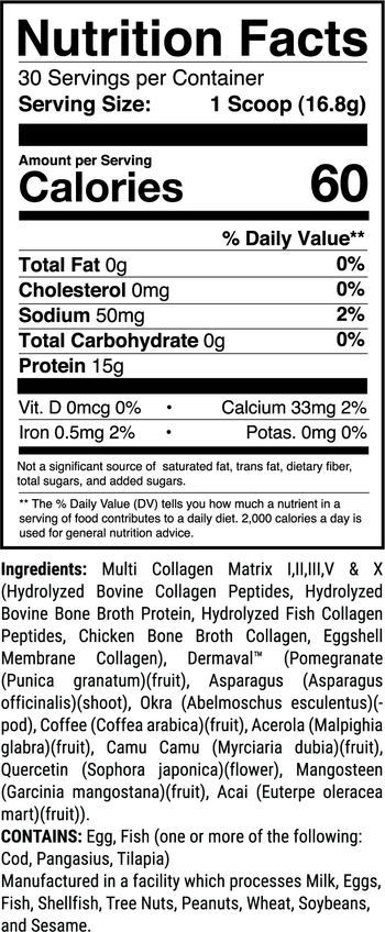 Unflavored: Contains Egg, Fish (one or more of the following: Cod, Pangasius, Tilapia). Manufactured in a facility which processes Milk, Eggs, Fish, Shellfish, Tree Nuts, Peanuts, Wheat, Soybeans, and Sesame.