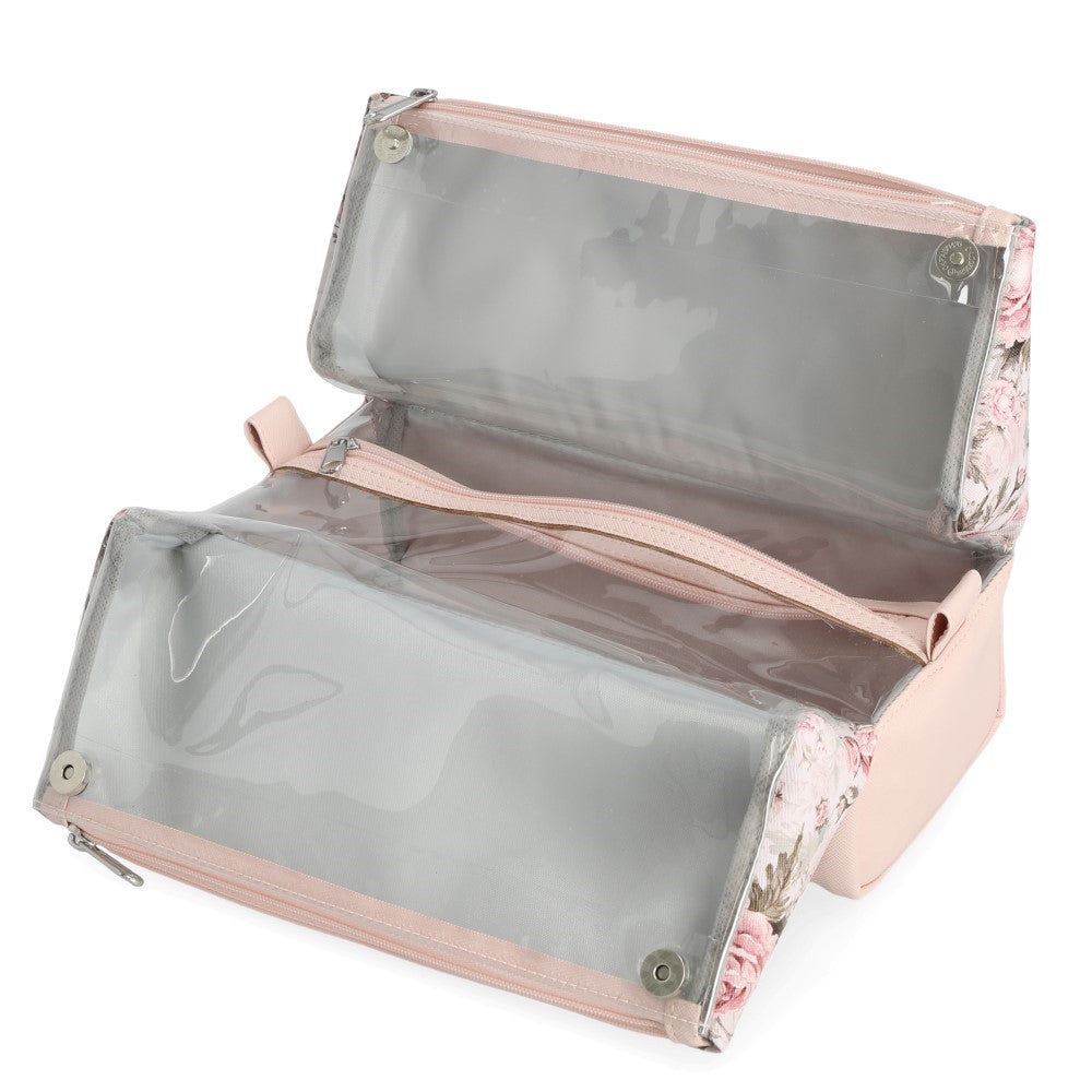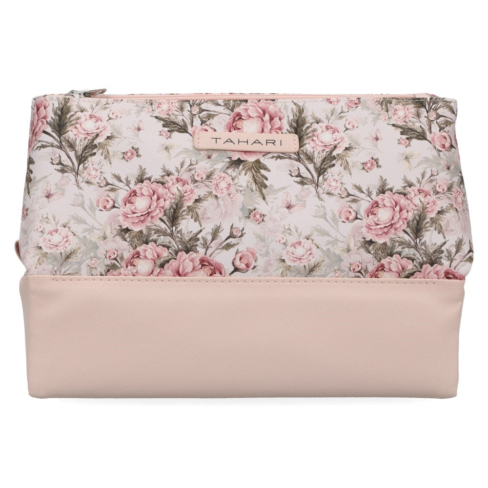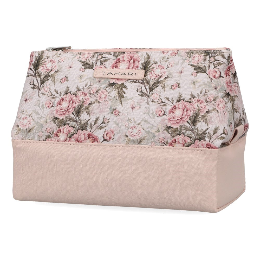 This Tahari 3 compartment pyramid cosmetic bag is the perfect cosmetic bag to keep all of your essentials organized. The pyramid case opens to revel 3 individual compartments; 2 side compartments and one bottle compartment. All 3 have zipper openings.