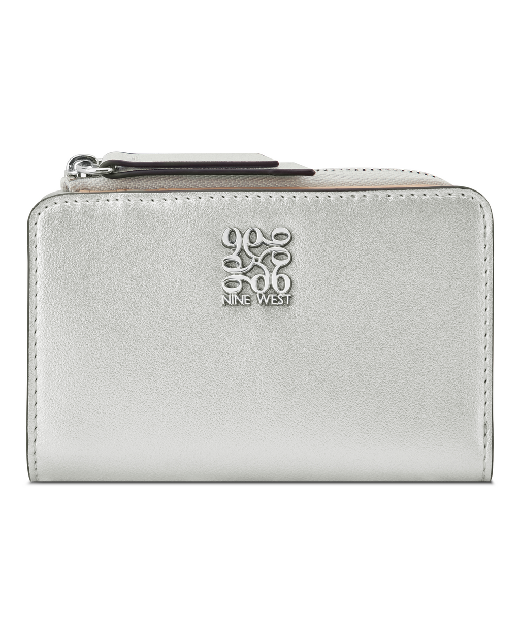 Nine West designer Cramer zip card case with internal slip and zipper pocket organization and external hardware details and branding. Designed in texture shine material.