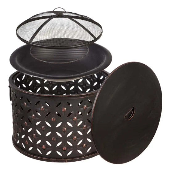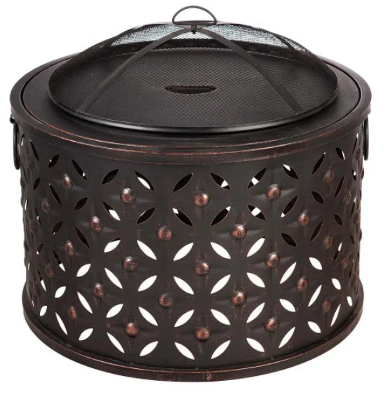 With round handles for easy maneuvering, this cylinder lattice firepit features a unique die-cut pattern. This firepit is crafted from durable, quality iron that is outdoor-safe. A heavy-duty spark guard and grate lifter are included.