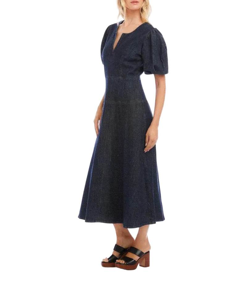 Designed with gathered shoulders and elasticized puff sleeves for soft volume, plus supportive bust darts for shaping, this dress falls to a refined midi length. A back zipper closure ensures a smooth fit, while visible waist and skirt panel seams add subtle structure and contour the silhouette for an effortlessly polished look.
