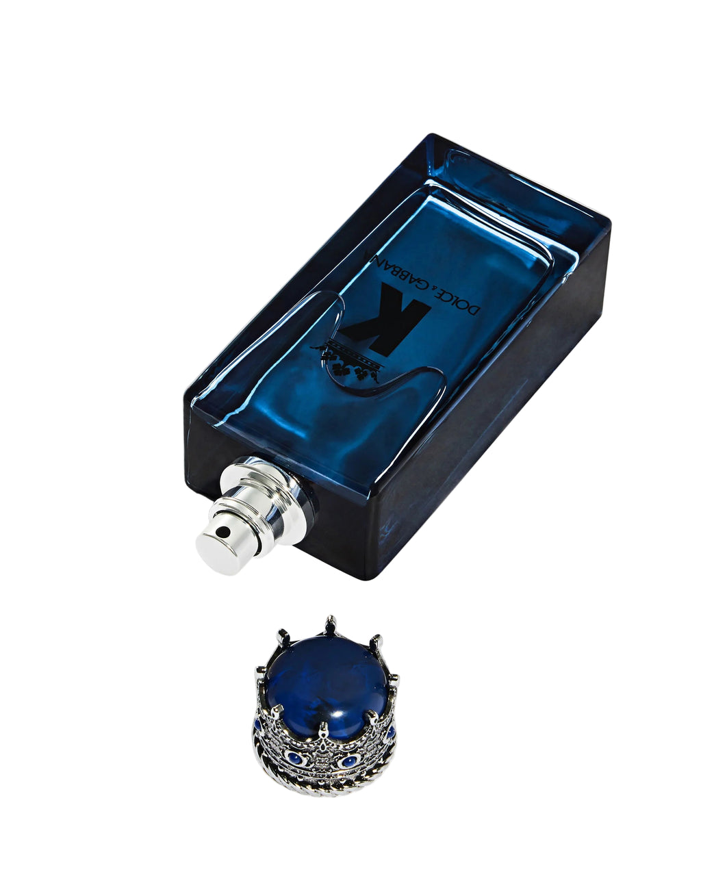 The flacon of K by Dolce & Gabbana Eau de Parfum shares the same geometric shape as the iconic original fragrance, taking on an intense regal blue hue. The crown which tops the flacon is coated with a burnished silver patina which exalts the refined blue lapis lazuli dome.