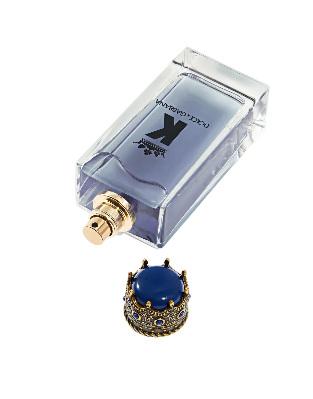 The geometric shape of the flacon of K by Dolce & Gabbana Eau de Toilette is embellished on top with a crown. Coated with 24-carat gold pigments, the cap is decorated with a blue lapis lazuli dome, using a process that recreates the natural marbling of the stone, making each piece unique.