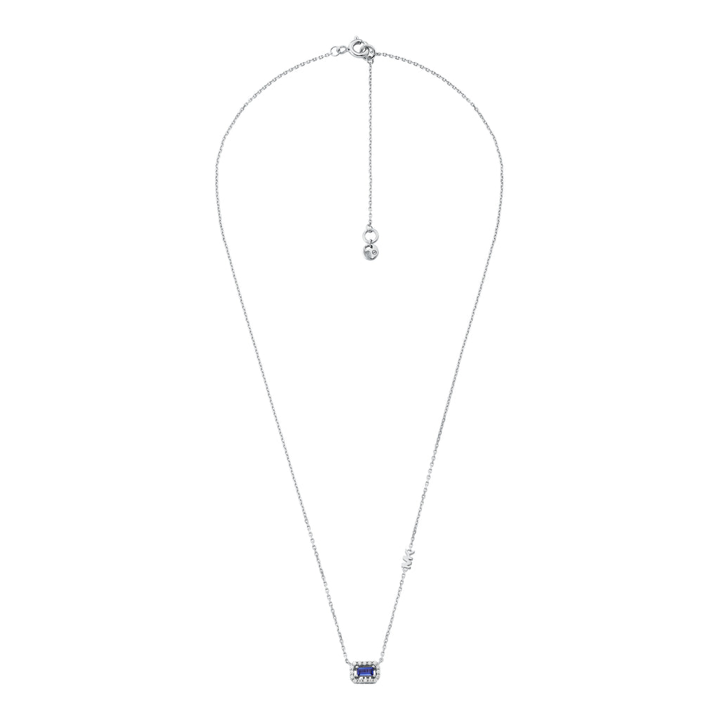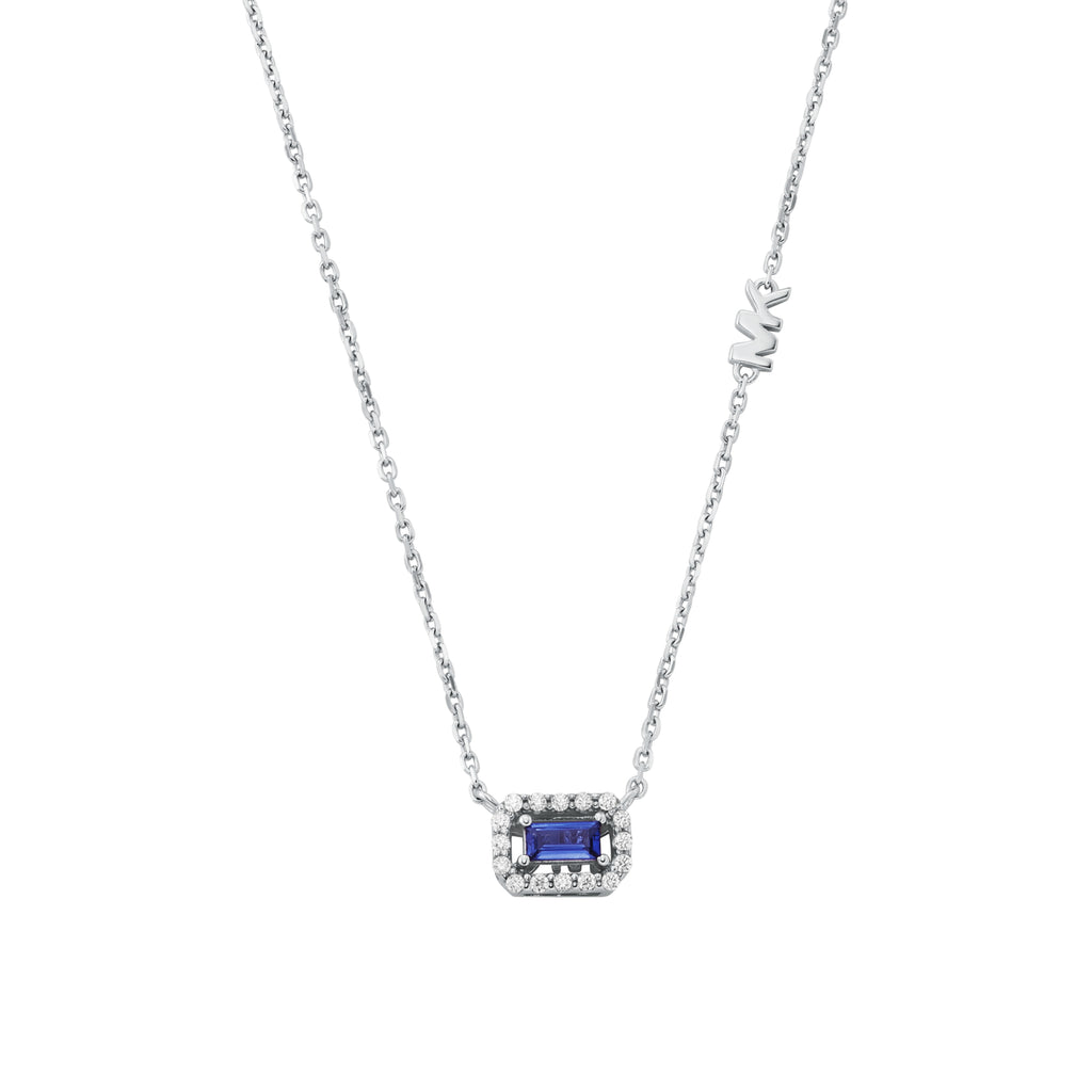 Elevate your everyday elegance with Kors Brilliance, your key to effortless luxury. Crafted from sterling silver and plated in rhodium, this emerald cut sapphire colored cubic zirconia necklace will elevate any look. Pair it with the matching earrings for a cohesive ensemble that radiates sophistication and style from every angle.