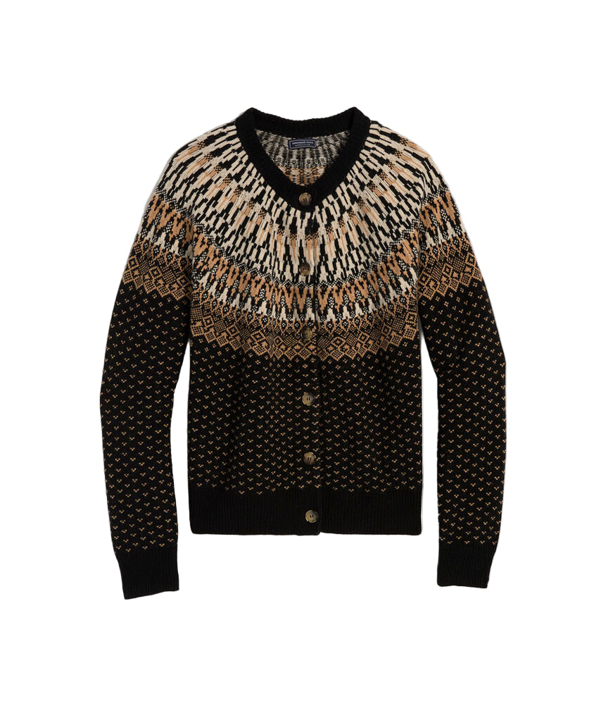 A fresh take on a perennial favorite, this Merino wool blend Fair Isle cardigan features versatile, lightweight yarn to make it the perfect, endlessly wearable layer to take you from season to season.