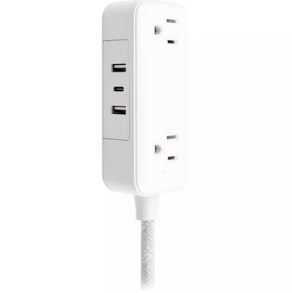 Power and charge your favorite electronics in style with a GE Extension Cord with USB Charging. Easily transform one outlet into an organized outlet extender with two USB-A charging ports, one USB-C charging port and two adapter-spaced grounded, three-prong outlets for the perfect home or office power hub. Power small household appliances, electronics and USB accessories while charging a laptop, tablet or other mobile device. This charging station’s 6ft. cord extends power to where you need it most, and the adapter-spaced outlets ensure there’s plenty of room to accommodate larger power adapters. While most indoor extension cords interrupt or distract from your room décor, this durable 6ft. braided power cord features a white and gray heather pattern, resists tangles and adds instant style to any space. Additionally, the power strip’s angled flat plug lets you insert it into a receptacle without blocking the other outlet. The flat plug’s low profile makes it perfect for use in tight spaces behind furniture kept close to the wall, such as a couch, desk or nightstand. Get the most from your outlet with a GE Extension Cord with USB Charging.