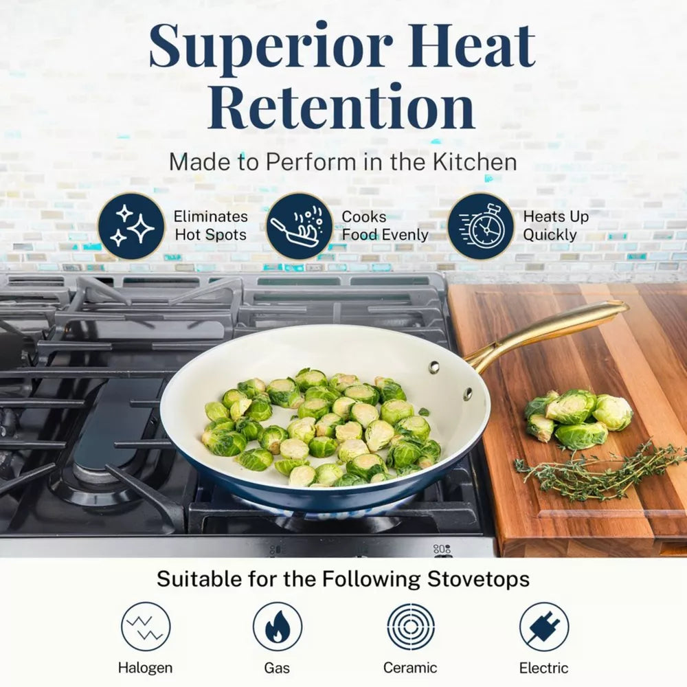 Enhance your culinary collection with the Gotham Steel Nonstick Ceramic Pots and Pans 12 Piece Kitchen Cookware Set, expertly designed in a refined Navy Cream finish. This heavy-duty set features a robust construction and a double-coated nonstick ceramic surface, delivering superior durability and excellent food release. Engineered for healthier cooking, these pans require minimal oil or butter, making them perfect for health-conscious chefs. With ergonomically designed stay-cool handles and the capability to withstand oven temperatures up to 500˚F, this versatile cookware transitions seamlessly from stovetop to oven. Ideal for everything from daily meals to special occasions, this set combines elegance with practicality, making it a splendid addition to any kitchen.