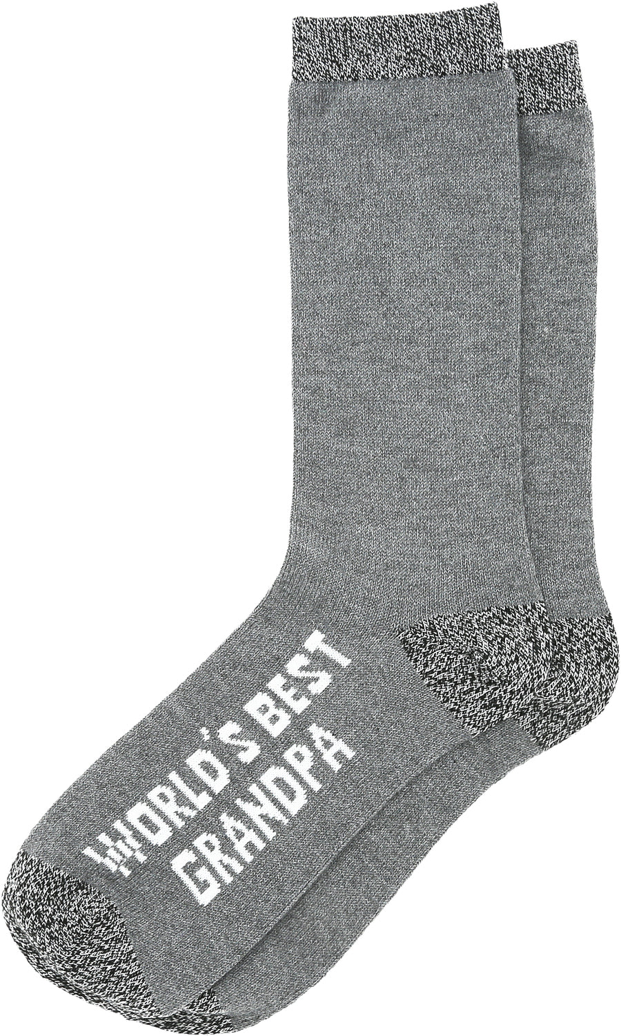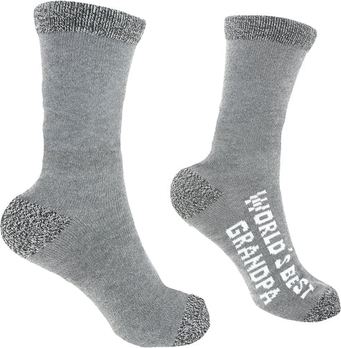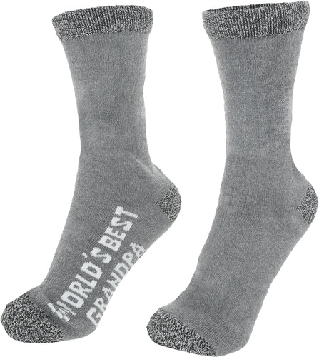 IN-HOUSE DESIGN: Crew fit socks feature a heathered gray ankle, heel, and toe and a lighter gray as the primary color. The top of the outside edge of the foot has white sewn-in "World's Best Grandpa" text. The ankle has a sewn-in cream-colored "Man Made" patch.