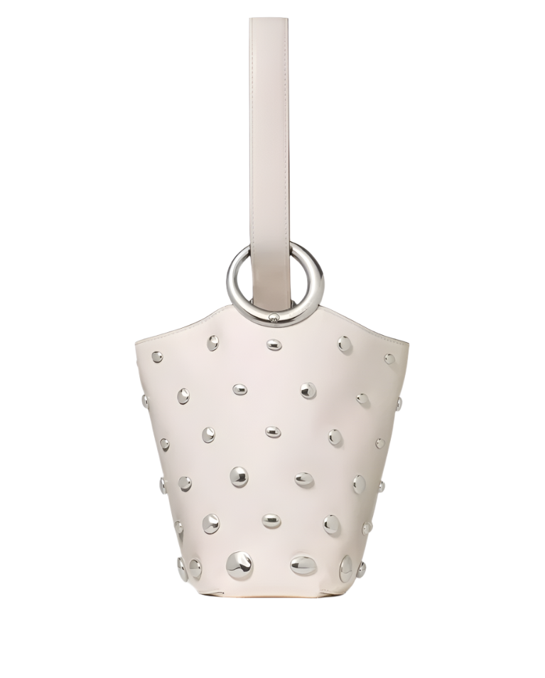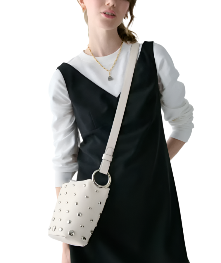 Product Details:Mini bucket bagSilver stud hardwareDetachable (and adjustable) crossbody strapImported