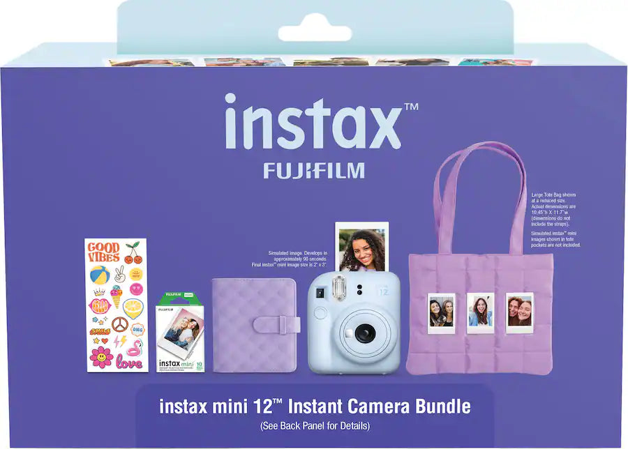 The super bubbly instax mini 12 instant camera bundle is bursting with joy, creativity and color. Not only is this iconic instant camera available in a super fun bundle, it’s fully loaded with easy-to-use modes and controls. Designed to keep up with life, the instax mini 12 instant camera is ready to go with a simple twist of the lens. Twist again and you’re in Close-up mode, perfect for selfies. Combined with the perfectly positioned selfie mirror, automatic flash control and instax mini instant photos, the instax mini 12 instant camera is a selfie extraordinaire. But that’s not all the Close-up mode can do. When activated, the viewfinder neatly pairs up with the lens, so what you see is what you get – no object shifts in your final instax photo! (FYI the fancy term for this is parallax correction.) Because when you’re this close, there’s no room for error. Plus, with automatic exposure, you can simply aim and click. No need to adjust any settings, just simply fun photos every time. And with that in mind, once you have snapped, your instax mini instant photo will eject in approximately five seconds (development time thereafter is approximately 90 seconds). All without compromising on image quality. That deserves high fives all around. When you’re finished capturing memories, twist the lens again to turn the instax mini 12 instant camera off. But the fun doesn’t end there. Download the free instax UP! App to your Smartphone for a new way to keep all your instax photos digitally, in one place. All you have to do is use the instax UP! App and your Smartphone to scan your printed instax photos and they’ll be turned into sharable, digital photos that you can edit, tag and save. Ready to twist & go? Get the most out of your instax mini 12 instant camera with film and these great accessories included in the bundle.