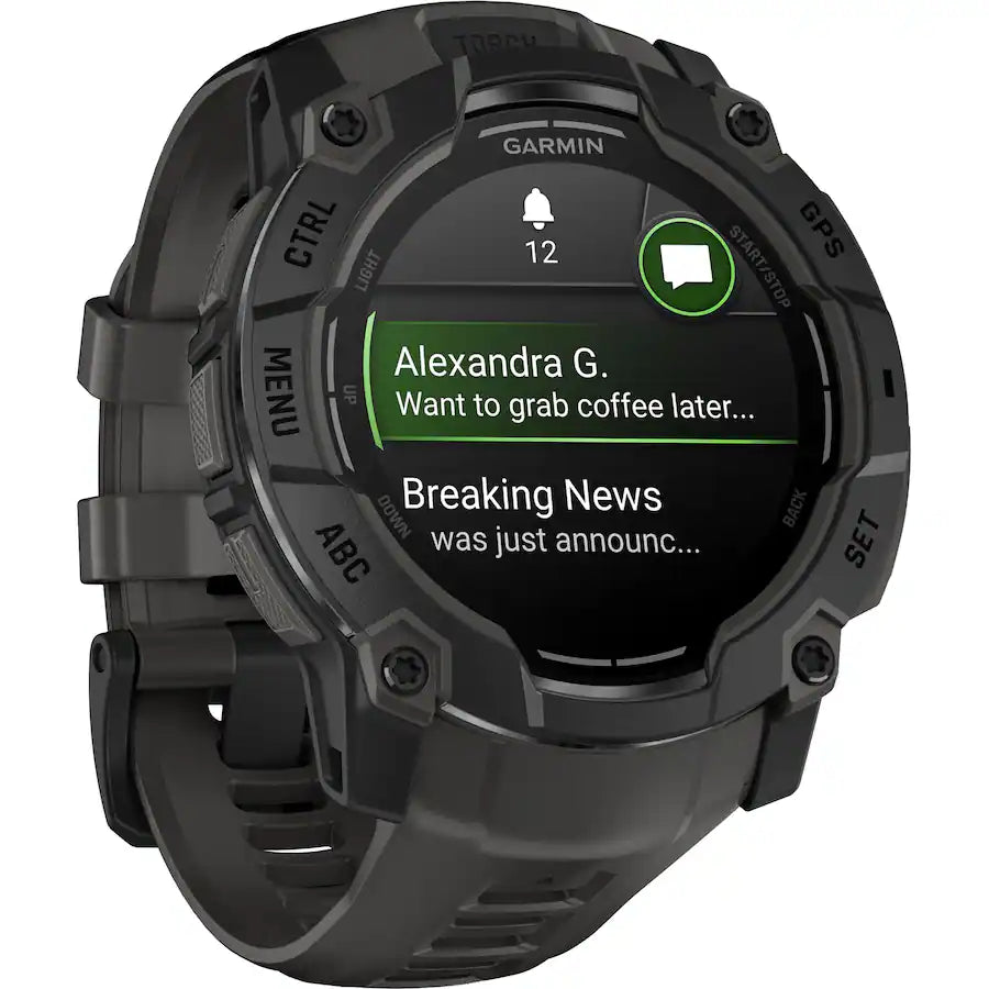 Instinct 3 is the rugged 50 mm GPS smartwatch with a 1.3” AMOLED display, a built-in flashlight and up to 24 days of battery life in smartwatch mode. With bolted construction, a metal-reinforced bezel and scratch-resistant lens, it can take on your toughest adventures. It’s engineered to MIL-STD-810 standards for thermal and shock resistance and is also 10 ATM water-rated. To keep you on track, the Instinct 3 smartwatch includes a built-in 3-axis compass and barometric altimeter. Plus, multi-band GPS with SatIQ technology delivers superior positioning while also optimizing battery life. Its 24/7 health and wellness features keep you connected to your body with heart rate tracking, advanced sleep monitoring, Pulse Ox and more (this is not a medical device, and data presented is intended to be a close estimation of metrics tracked; Pulse Ox not available in all countries). Instinct 3 also includes Garmin Pay contactless payments (with a supported bank).