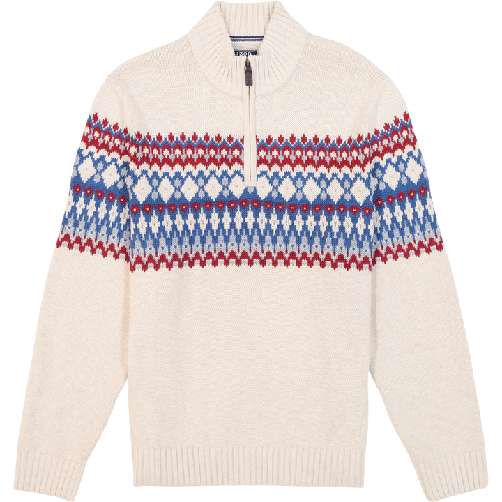 Fair Isle--at the first sign of frost. This super soft, 1/4-zip pullover plays the part when there's a chill in the air. Classic fit with a classic pattern for chestnuts roasting by an open fire.