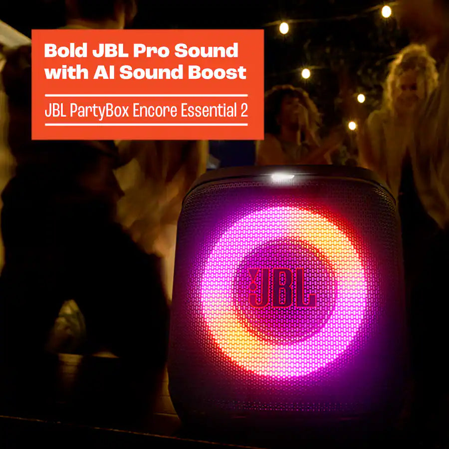 Power up the JBL PartyBox Encore Essential 2 and let the good times roll. With this portable speaker, you'll want to play DJ at every event, with smooth JBL Pro Sound and a light show to fit the mood. Feel that extra oomph in your chest from the epic highs and deep lows, whether you're playing a new pop ballad or going with a classic slow jam. Once you’ve nailed the soundcheck, it’s time to turn up the ambiance with a light show that grooves to your beats.From open rooftops to crowded basements, the JBL PartyBox Encore Essential 2 knows how to adapt, with its grab-and-go handle and IPX4 splash-proof design. What’s better than one JBL PartyBox Encore Essential 2? Two! Pair them up for TRUE stereo vibes or link with other JBL Auracast-enabled speakers for an even wilder dance party. Keep the good vibes going on a single charge with up to 15 hours playtime. Make the vibes immaculate with the JBL PartyBox app, where you can control your playlist, add fun sound effects, and pick the perfect light show mood—all while you’re doing the worm on the dance floor. Whatever the occasion, the JBL PartyBox Encore Essential 2 knows how to bring all the feels.