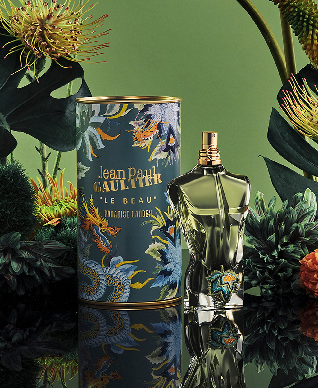 Enter this wonderland of temptation and discover Jean Paul Gaultier’s garden. A sumptuous paradise of exotic creatures, like a lush Eden... it is here that Le Beau Paradise Garden can be found. Burning with passion, the original man displays a true sense of style with his embellished sculpted torso. Inspired by the 2010-2011 Fall/Winter ready-to-wear collection. The enticing tropical-green bottle and woody, heavenly fragrance are particularly noteworthy. Let yourself be carried away on this euphoric odyssey... simply irresistible.