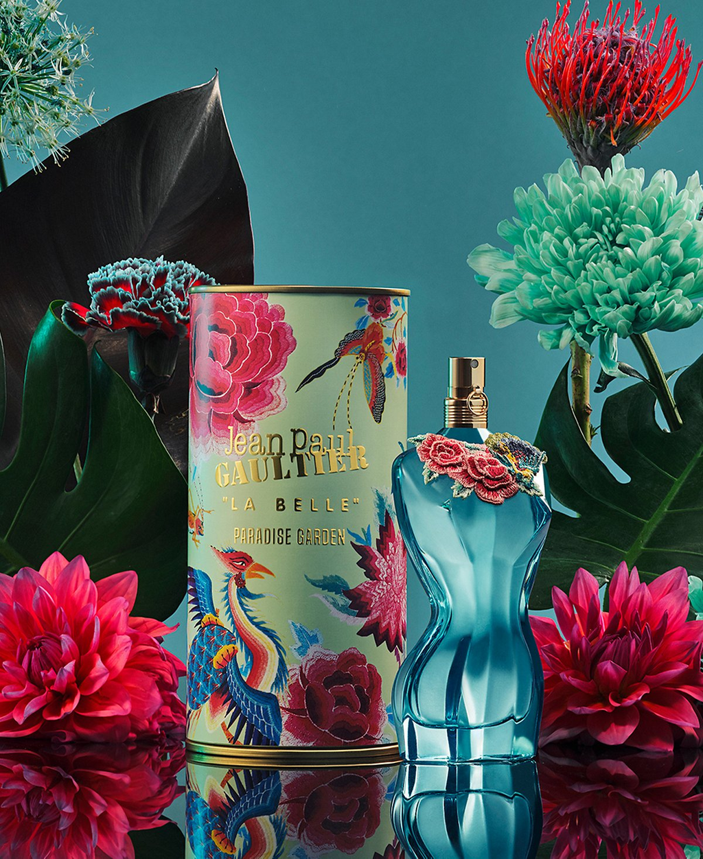 Paradise filled with exotic creatures... enter this wonderland of temptation and discover Jean Paul Gaultier's La Belle Paradise Garden. Fiercely independent, the original woman displays her sculpted curves adorned with garlands as bright as they are colorful, inspired by the 2010-2011 Fall/Winter ready-to-wear collection. This lagoon-blue bottle radiates natural beauty while its amber floral fragrance captivates the senses. Give in to its subtle aphrodisiac charm.