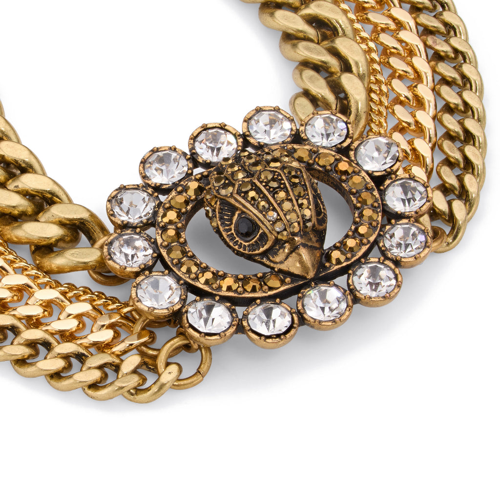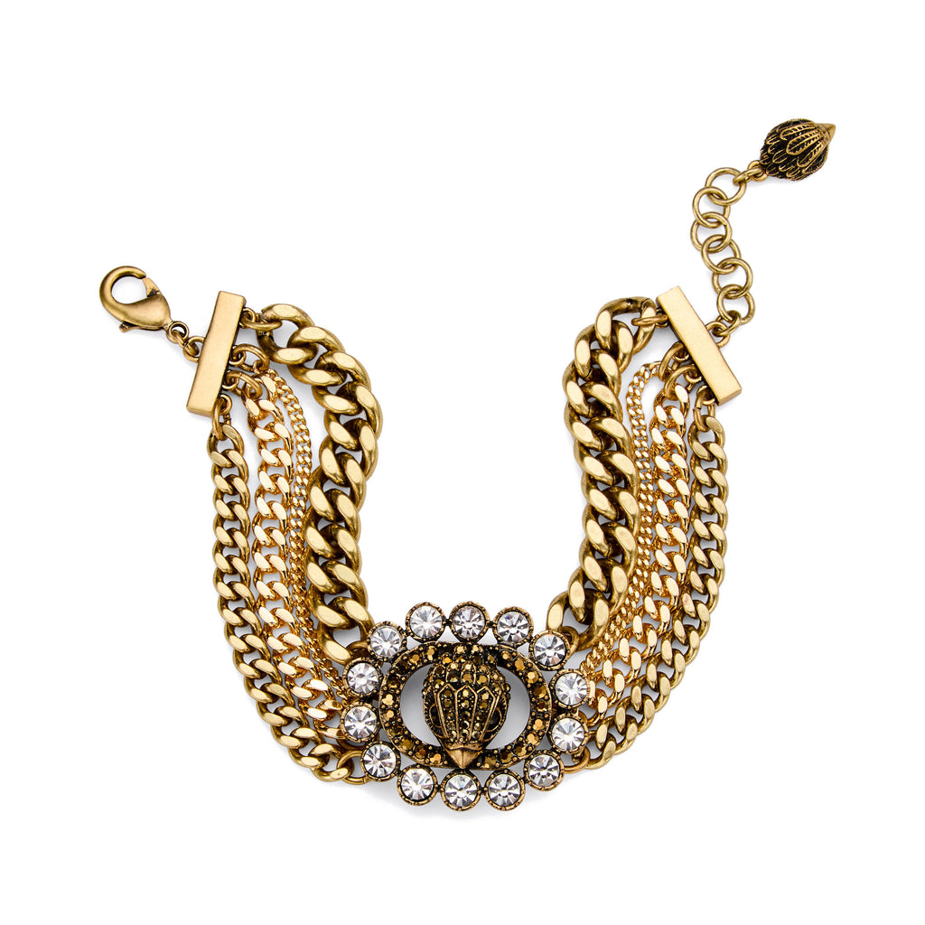 Refined curb chain link multi-strand layered bracelet featuring signature Chelsea eagle motif at front haloed with crystal stone gems for a sparkly touch. Bracelet has an adjustable lobster clasp closure. Made from brass and glass crystal.