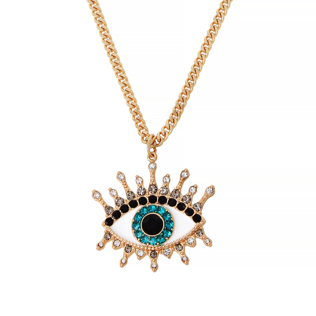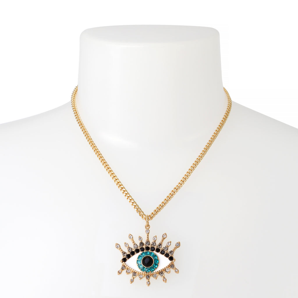 Bold curb chain necklace featuring mystical evil eye pendant adorned with mixed colored stone accents.