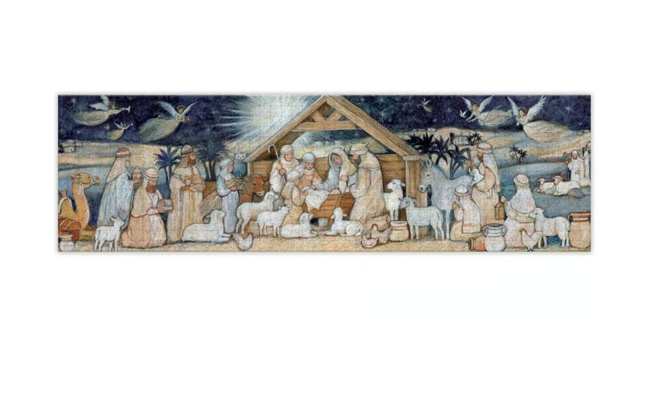 The panoramic view of the Nativity Set 750 Piece Puzzle perfectly frames this painting by Susan Winget that captures and celebrates the birth of Christ. With precision cut pieces and art print for visual reference, the Nativity Set Jigsaw Puzzle is a fun activity to do when the weather is cold or makes a great holiday gift! The art print guide makes an easy visual reference as well!