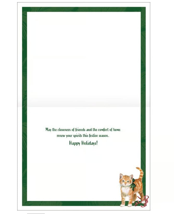 Inside greeting reads: 'May the closeness of friends and the comfort of home renew your spirits this festive season. Happy Holidays!'