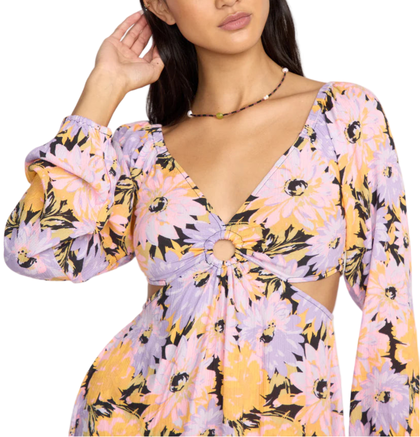 Billabong's flirty mini dress brings the drama with strategic side cut-outs and a v-neck adorned with a metal o-ring detail. The fitted bodice flows into an easy skirt, while full-length sleeves complete the look.