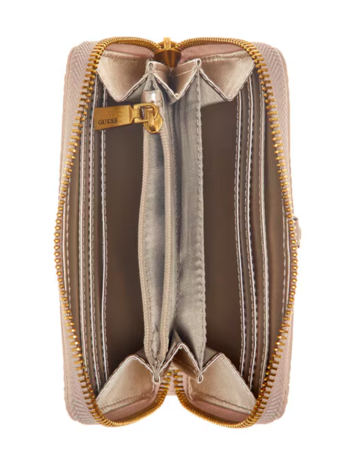 Product Details:Faux-leather medium walletGold-tone hardware with front monogram emblemSplit-compartment construction with middle zip pocketZip-around closure2 slip pockets6 card slots