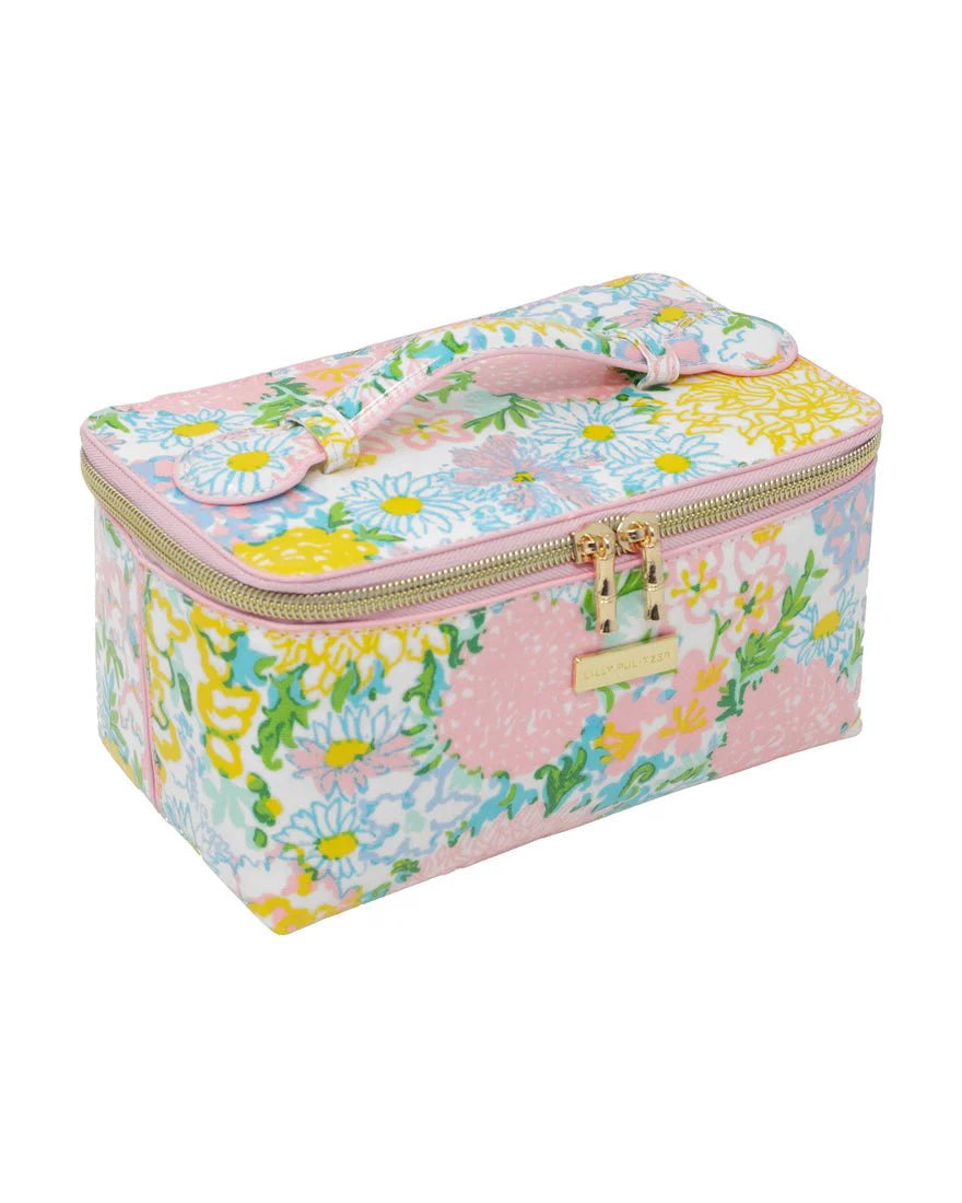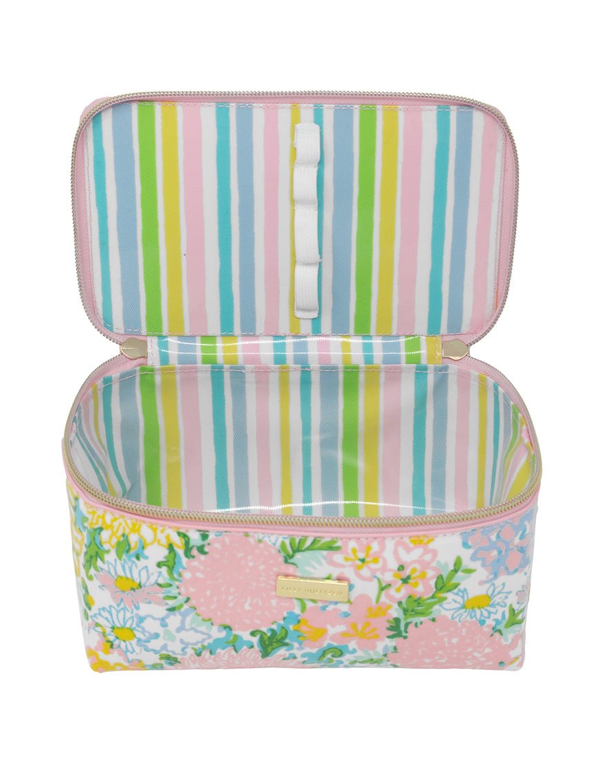 Meet your new favorite travel case! This rectangular vanity case is printed with the Lilly Garden Home print and is lined with a coordinating pattern. The lid fully unzips and stays open to make packing and unpacking a breeze. The sturdy top handle and metal bamboo-shaped zipper pulls add to the charm.