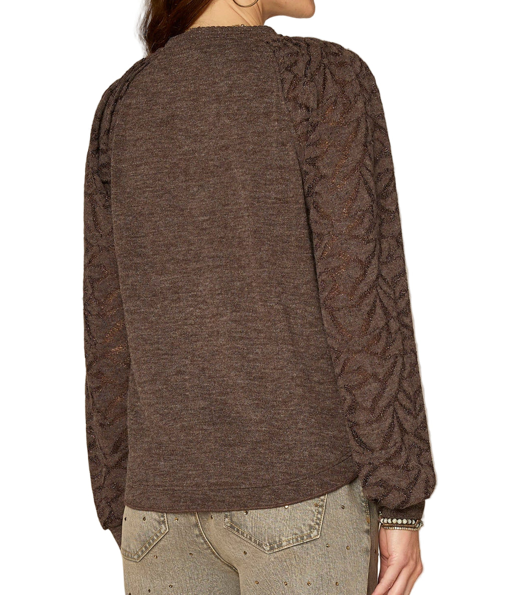 With its dark heather espresso colorway and comfy jersey knit fabric, this mixed media top is your new cold weather go-to. It features long blouson sleeves, pleated shoulders, and a scallop edge mandarin collar with a half placket.