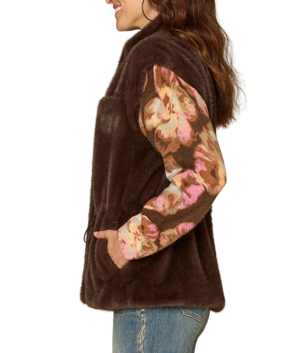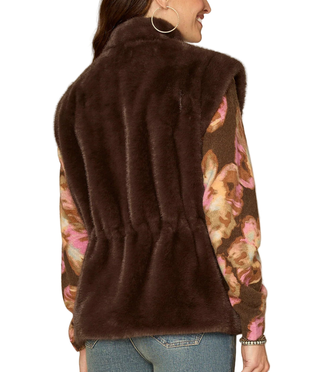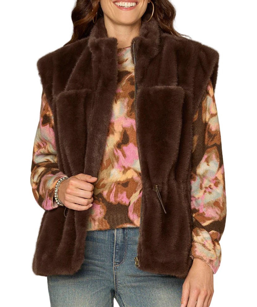 This woven faux fur vest helps you add effortless style points to your look while keeping cozy. It’s designed with a funnel neck, zip front, toggle waist ties, and four pockets.
