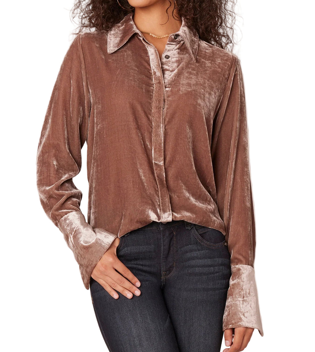 Shiny, chic, and sure to go with everything in your wardrobe. This velvet woven shirt features long sleeves with French cuffs, a collared neck, and a button front.