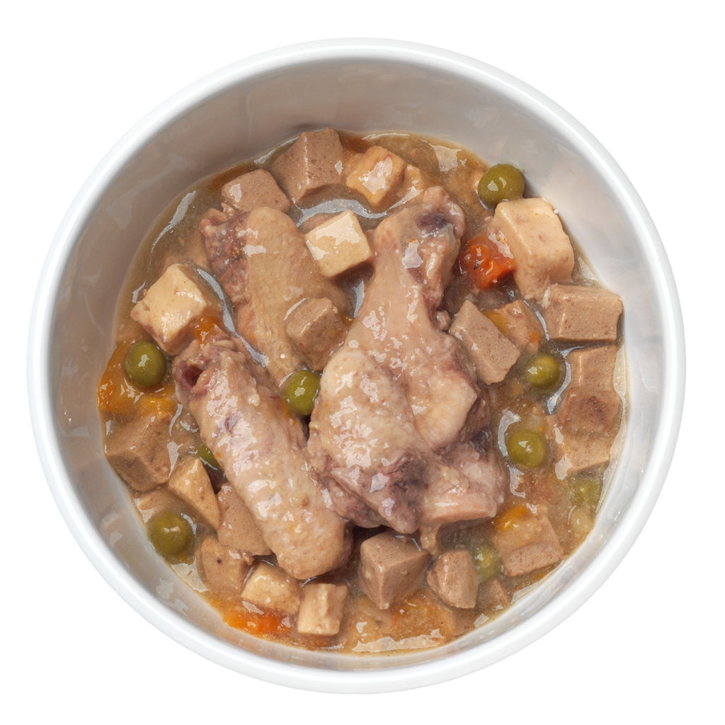 Chicken, Chicken Broth, Peas, Sweet Potatoes, Carrots, Apples, Chicken Liver, Dried Egg Product, Natural Flavor, Calcium Carbonate, Sodium Phosphate, Gum Ghatti, Xanthan Gum, Dried Potatoes, Salmon Oil, Potato Starch, Potassium Chloride, Salt, Choline Chloride, Guar Gum, Sunflower Oil, Cassia Gum, Flaxseed Oil, Minerals (Zinc Amino Acid Complex, Iron Amino Acid Complex, Manganese Amino Acid Complex, Copper Amino Acid Complex, Potassium Iodate, Cobalt Glucoheptonate, Sodium Selenite), Vitamins (Vitamin E Supplement, Vitamin B12 Supplement, d-Calcium Pantothenate, Vitamin A Supplement, Niacin, Vitamin D3 Supplement, Riboflavin Supplement, Folic Acid, Pyridoxine Hydrochloride, Biotin, Thiamine Mononitrate), Rosemary, Sage, Thyme, Yucca Schidigera Extract
