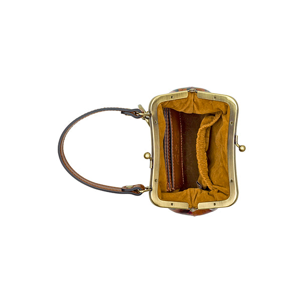 Kiss-lock closure; Signature brushed brass hardware, heavy handcrafted stitching