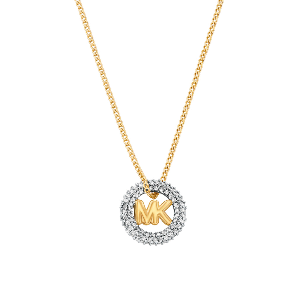 The Kors MK collection of jewelry celebrates Michael's life and work, with the signature MK logo featured as a core design element. This pendant necklace showcases a gold-tone chain and logo adorned with sparkling pavé accents. The scale and secure spring ring closure makes it perfect for everyday wear.